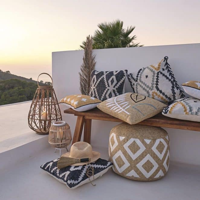 Accumulez des coussins extérieurs sur votre balcon ou terrasse pour créer un coin confortable, où vous pouvez vous asseoir pour lire ou profiter du soleil ACHETER : Coussin tissé extérieur : 39,99€