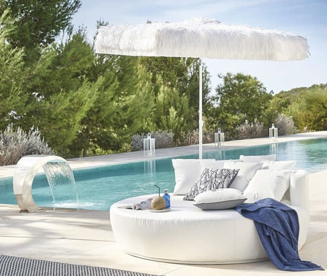 Protégez-vous du soleil pendant vos séances de bronzage, à l’abri d’un joli parapluie. Les parapluies frangées sont très tendance cette année, apportant une petite décoration kitsch (style Ibiza ou Miami).