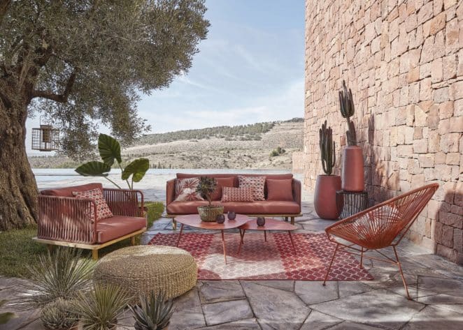 Très à la mode depuis quelques années, la terre cuite est une couleur qui est parfaitement adaptée à la disposition d’un style extérieur méditerranéen/ethnique .