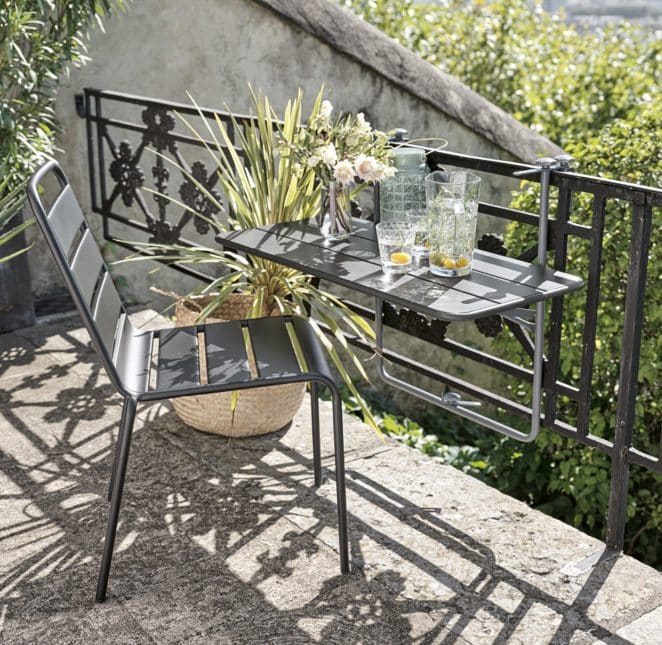 Attachée à la rampe, cette petite table en métal vous permet d’avoir une salle à manger pour une ou deux personnes sur son balcon ACHETER : Table de balcon pliante en métal : 59,99€